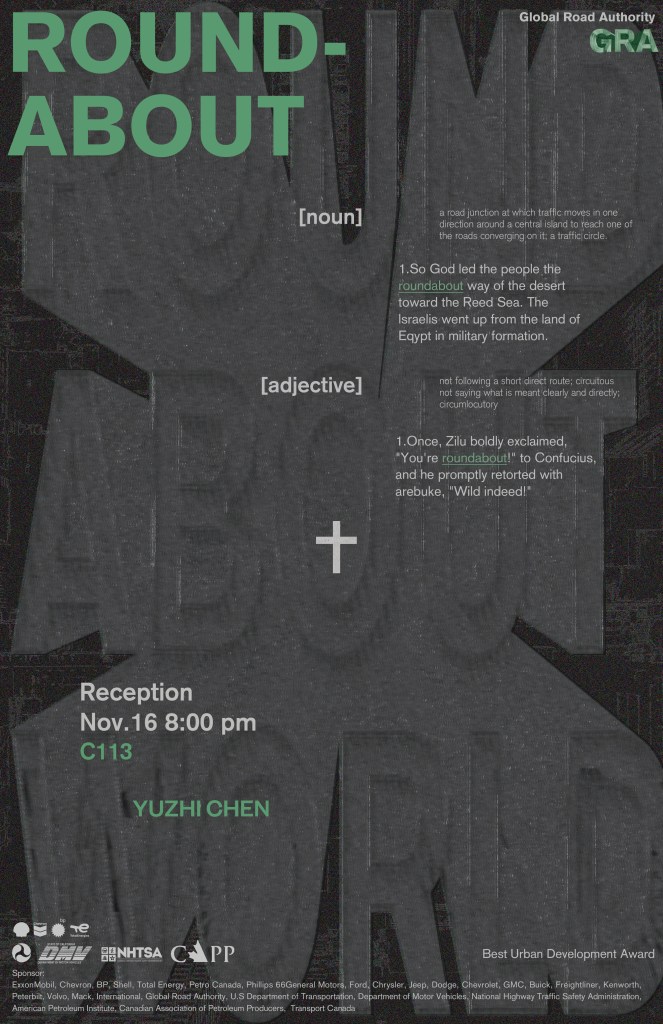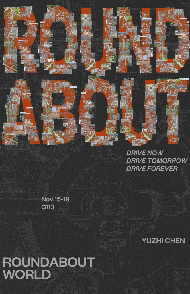 Driving in a Roundabout in Alaska for 47 Minutes was performed by Yuzhi Chen on November 23, 2023, in Anchorage, Alaska, accompanied by Alessandro Streccioni and Yudan Zhou in a rented Fiat 500 (via Turo).