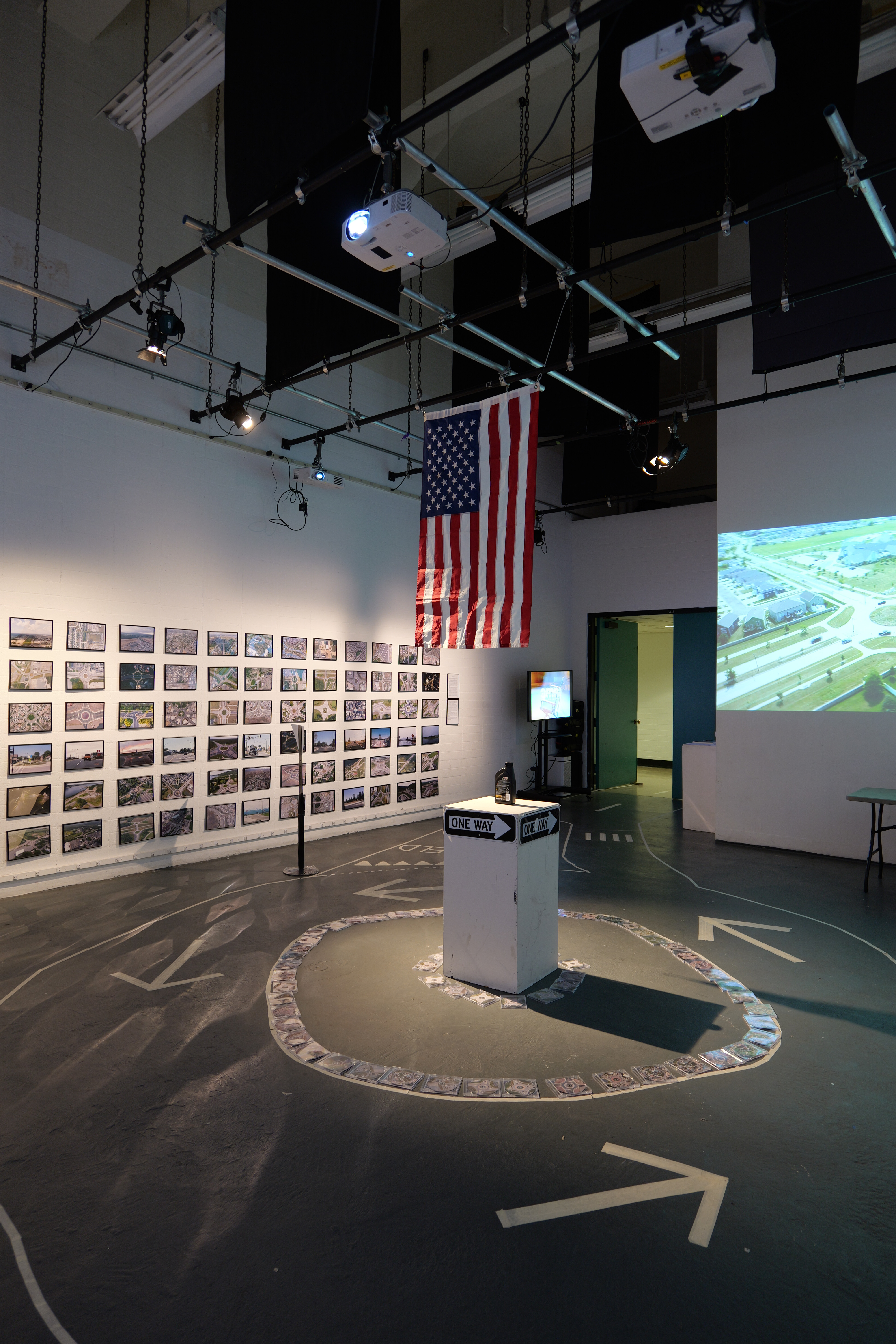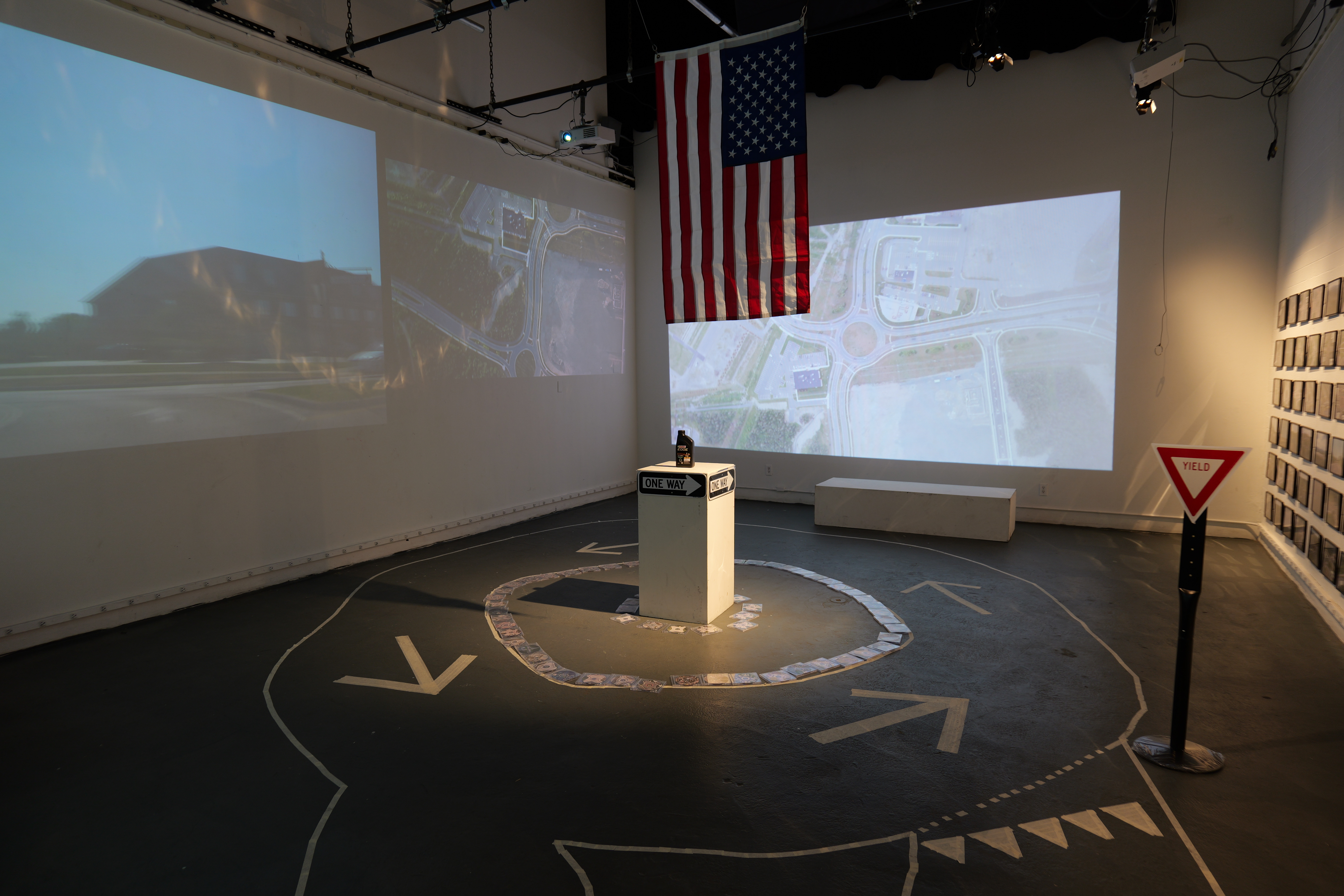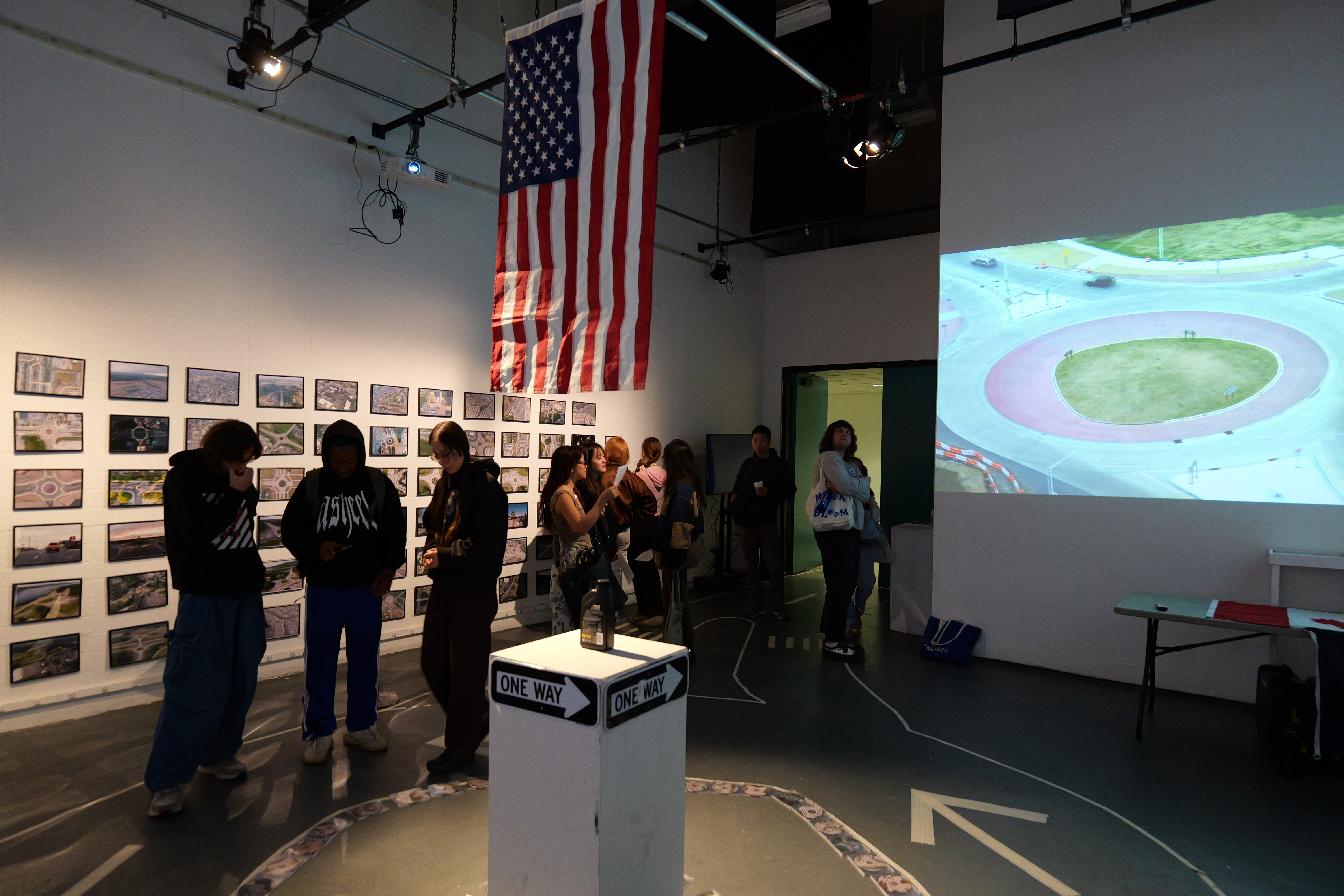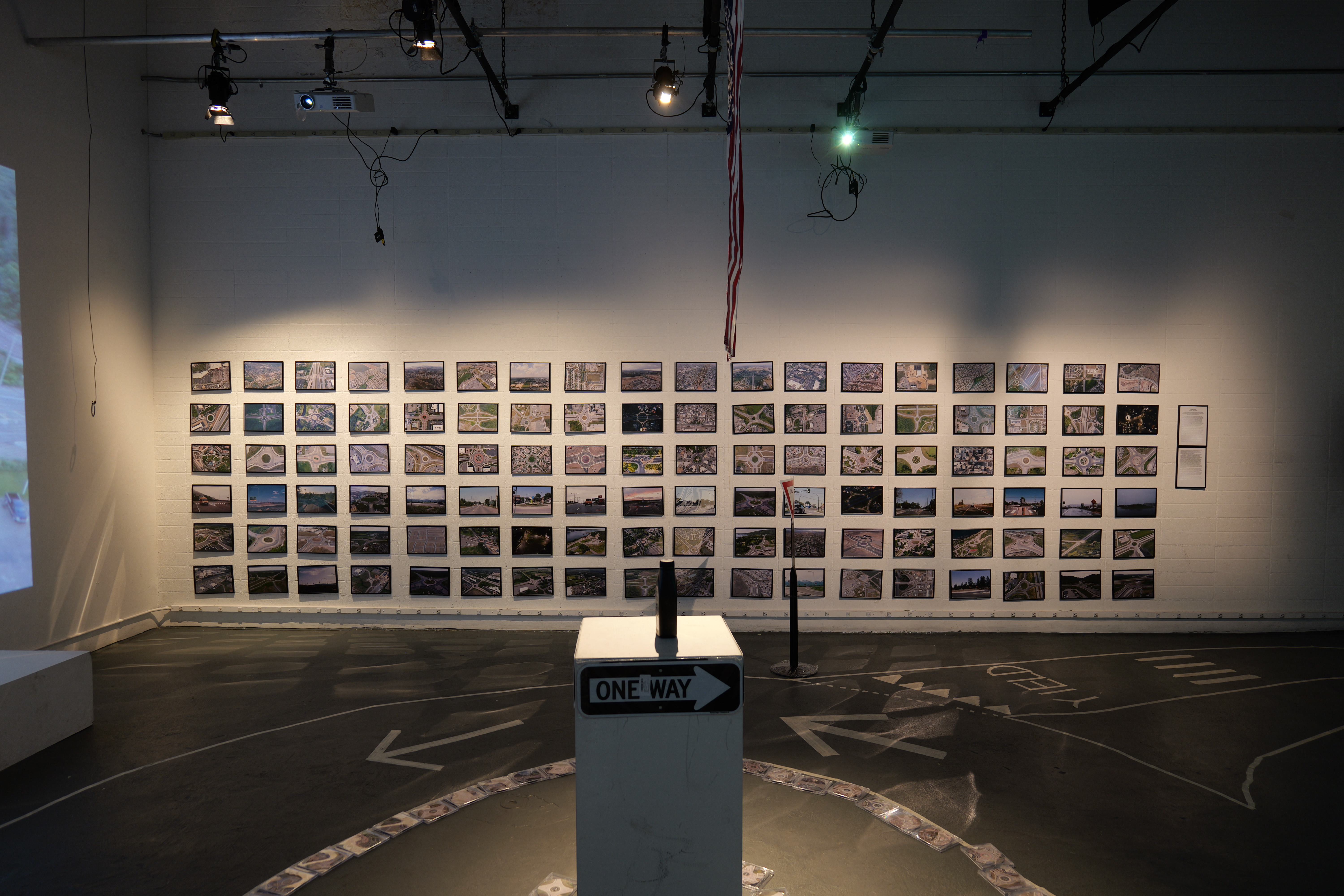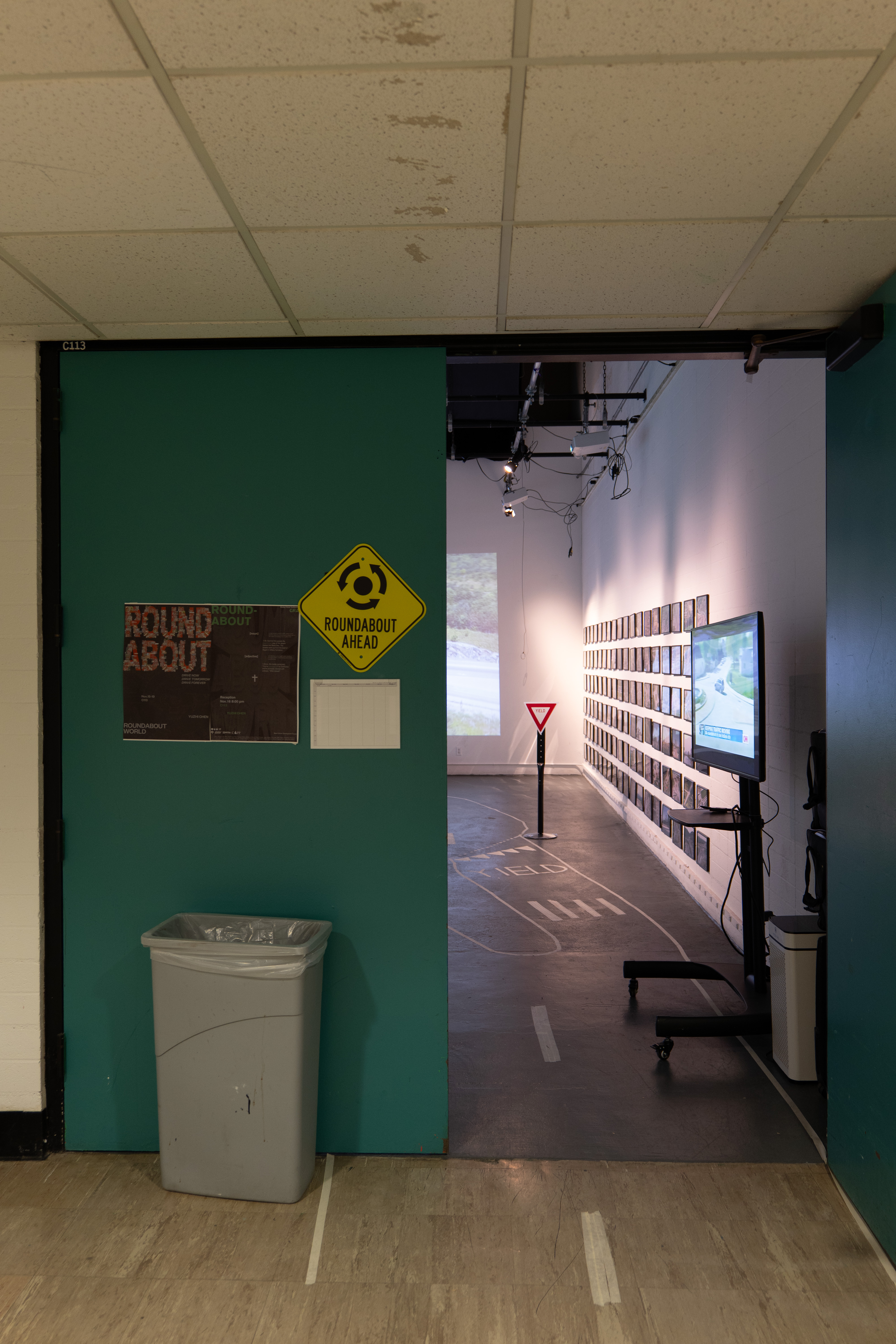 Installation at California Institute of the Arts, C113 in 2023. With printed roundabout photographs, roundabout movies, round foods (such as bagels, pizzas, cookies), roundabout CDs and a hand-made custom roundabout for C113.