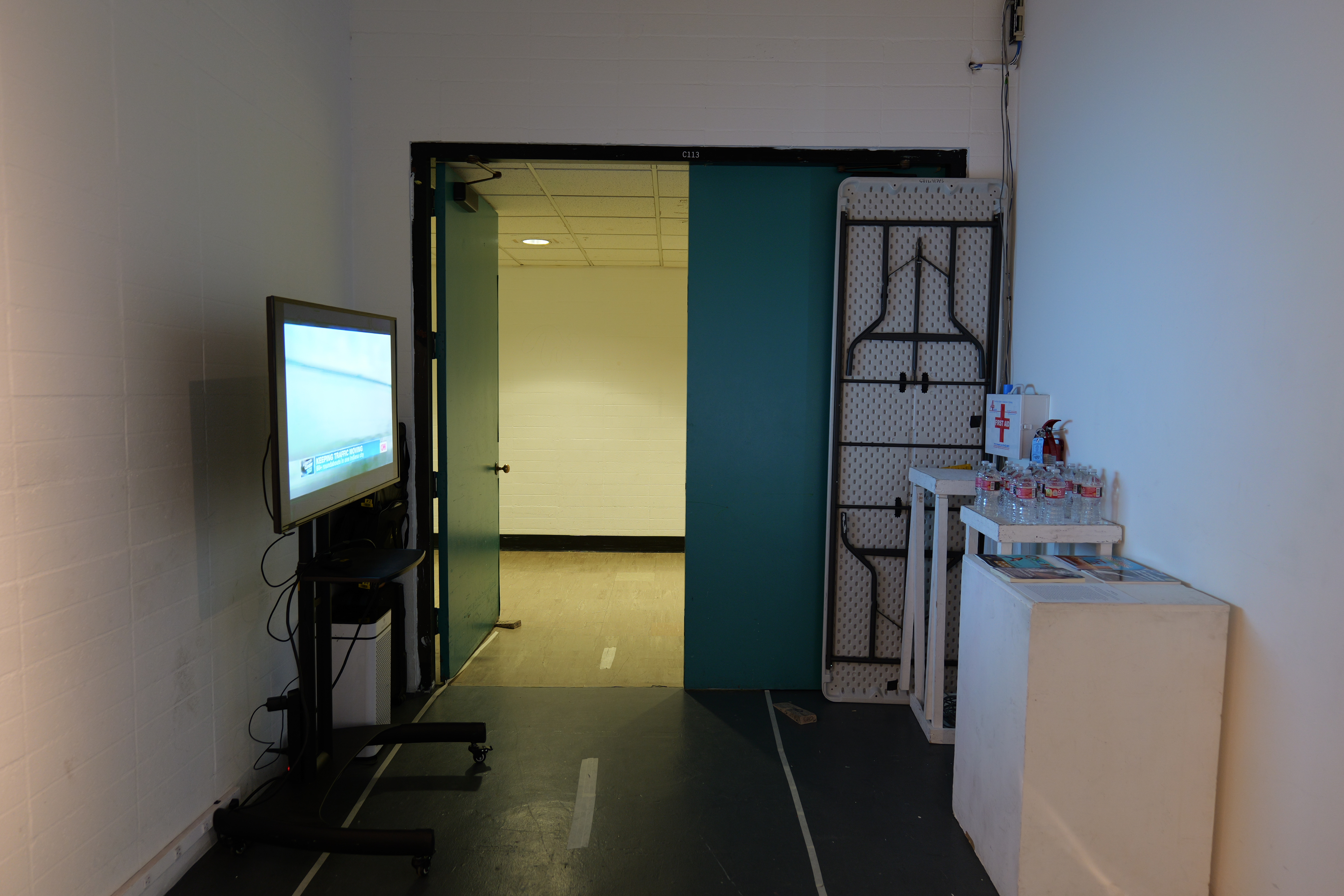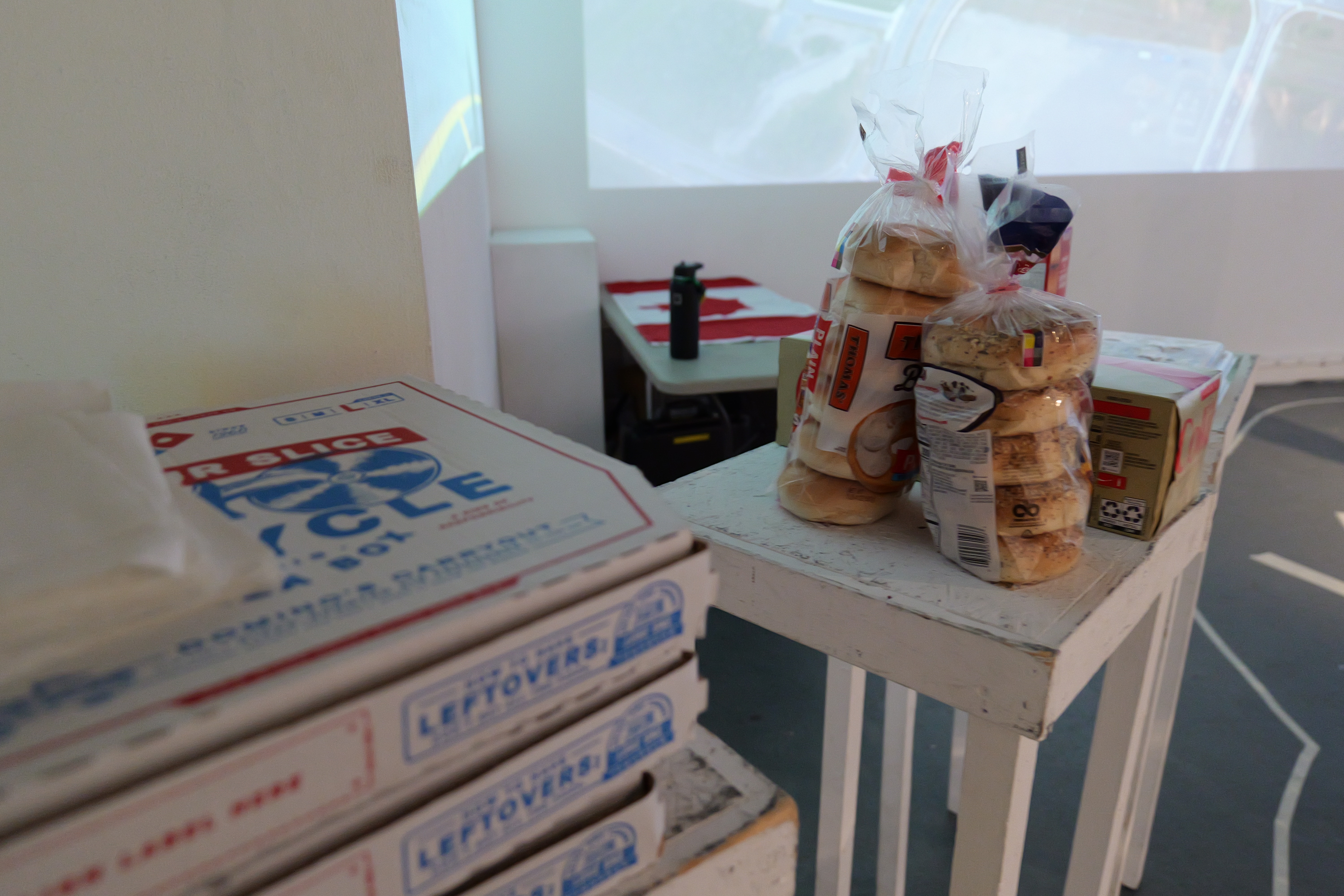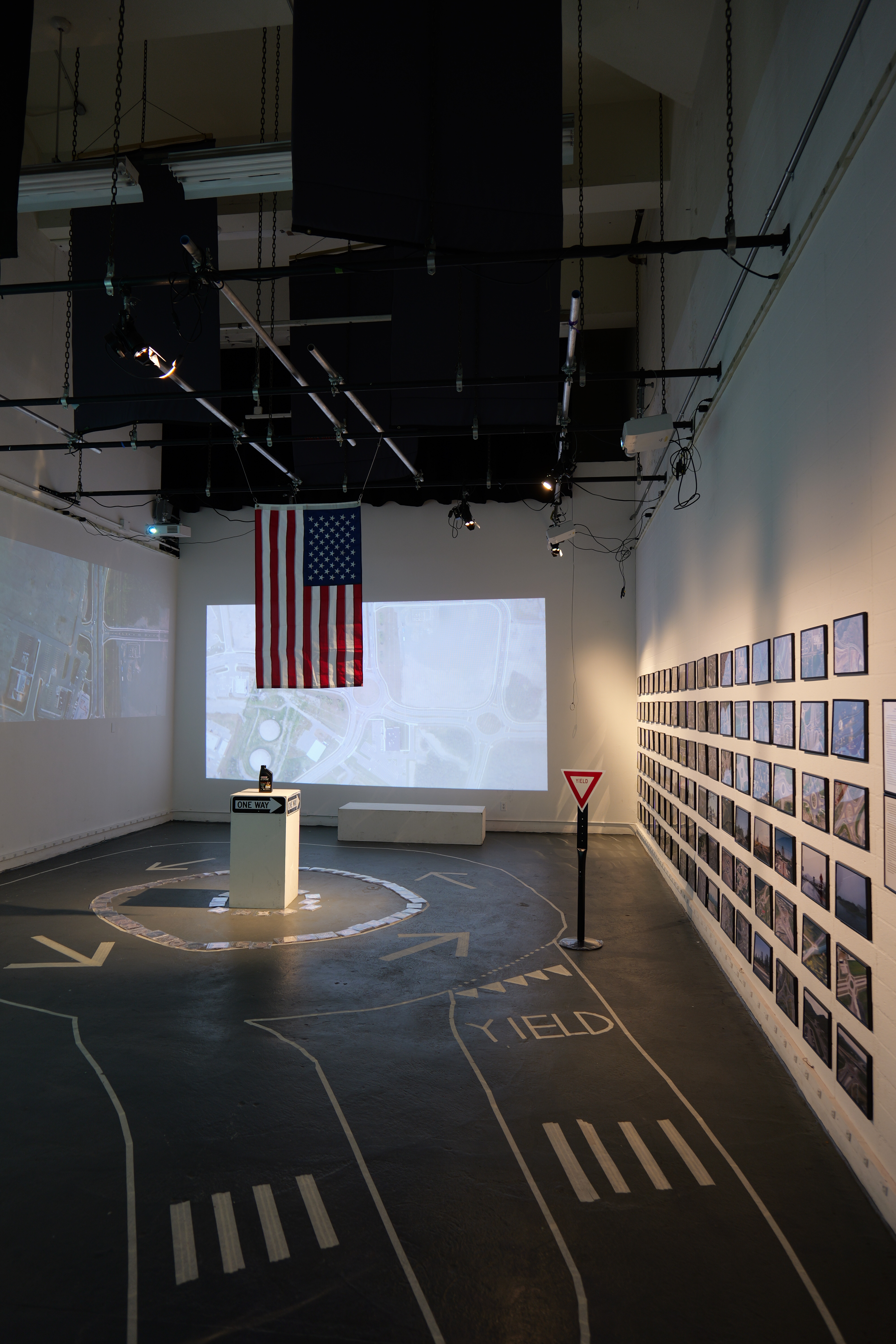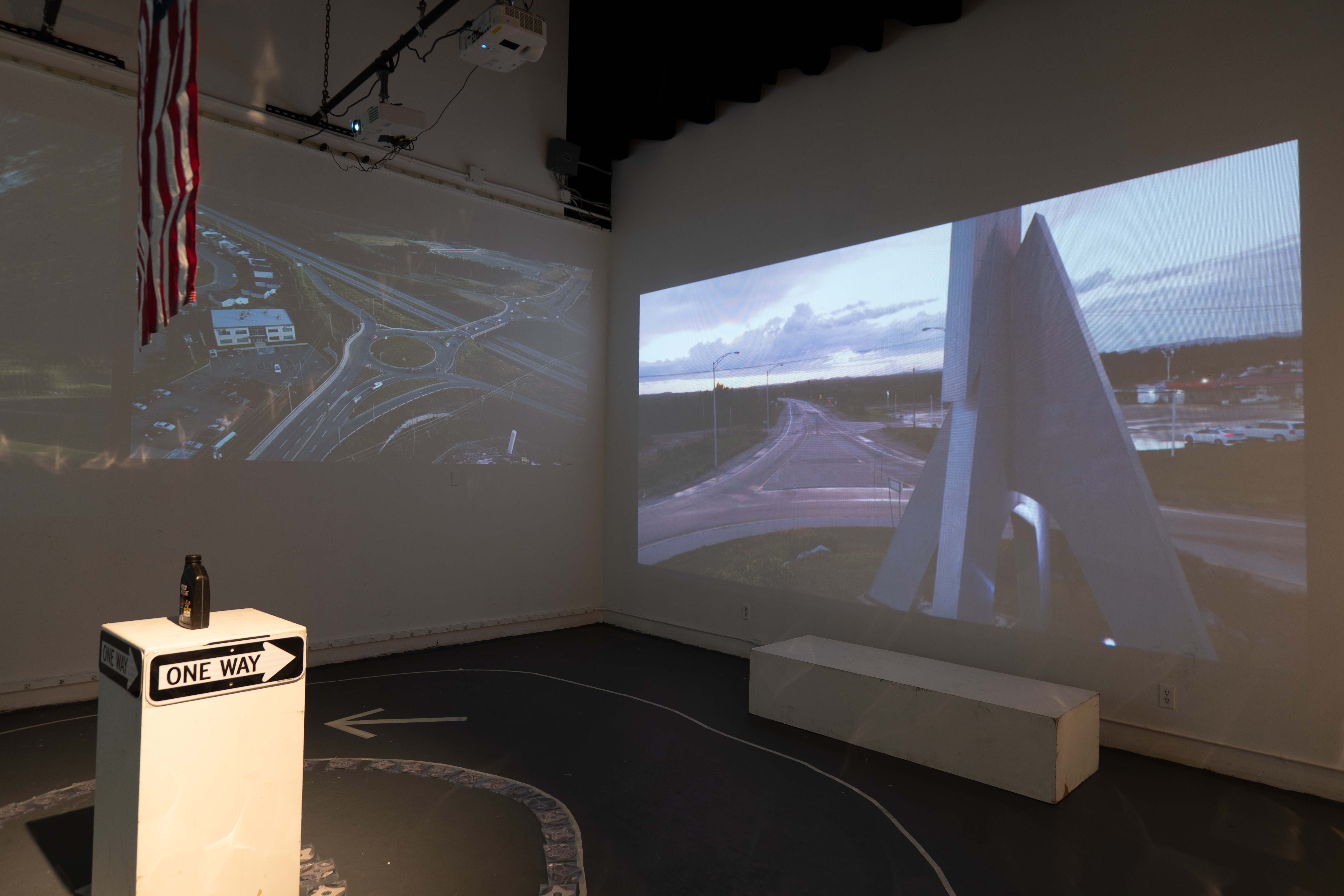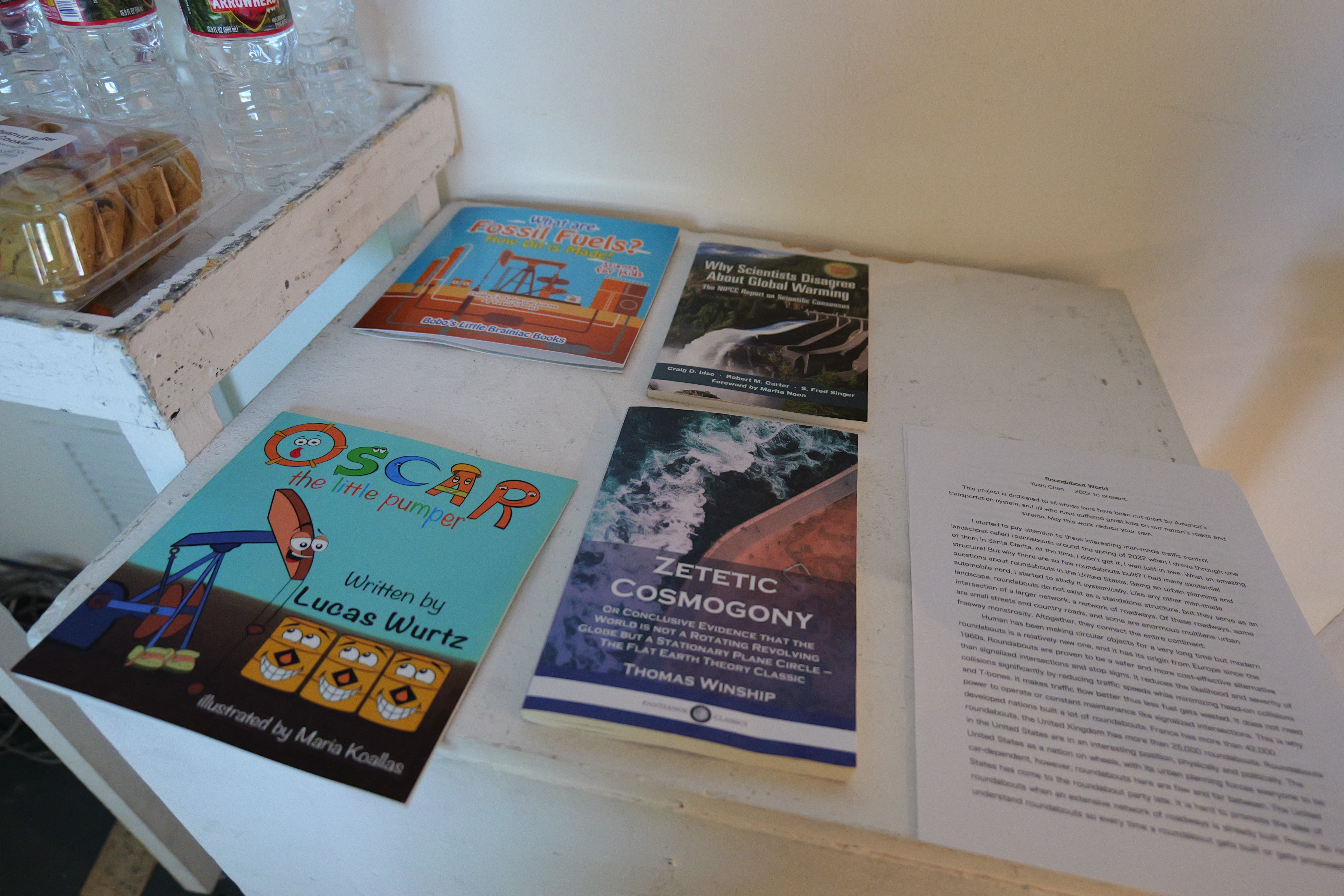 Installation at California Institute of the Arts, C113 in 2023. With printed roundabout photographs, roundabout movies, round foods (such as bagels, pizzas, cookies), roundabout CDs and a hand-made custom roundabout for C113.